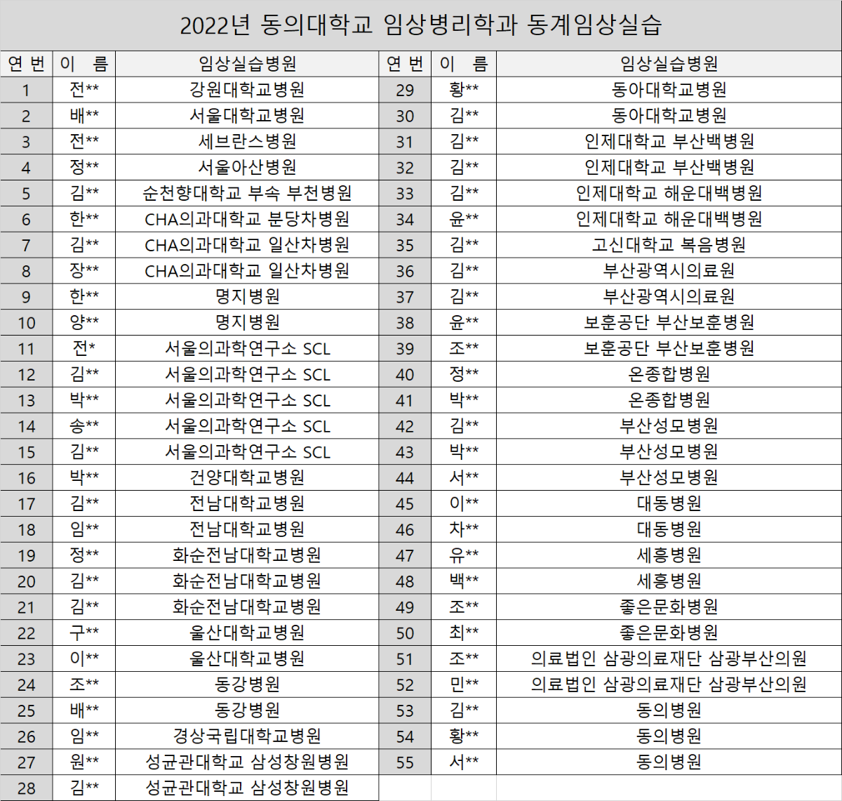 2022년 동의대학교 임상병리학과 동계임상실습 병원현황을 아래와 같이 안내합니다.