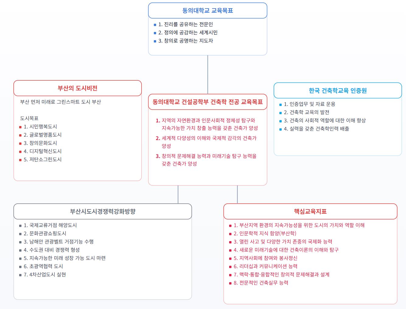 우리 건축학 전공은 동의대학교의 목표와의 연계, 나아가서 지역사회, 특히 부산의 도시비전과 같은 맥락속에서 지역과 세계에 이바지 할 인재상을 키우기 위한 교육목표를 설정하였다. 즉, “부산지역의 지속가능한 발전을 위해 지역성을 기반으로 한 창의성, 심미성, 논리성, 기술성을 배양시켜 종합적 건축능력을 갖춘 인재 양성”이다. 또한 본 건축학전공의 교육목표에 따라 설정된 8개의 정성적인 핵심교육지표는 부산이 시급히 해결해야 할 핵심적인 건축 및 도시의 문제와 과제를 대상으로 건축설계 및 이론 과목에서 추구하고자 의도하고 있다.