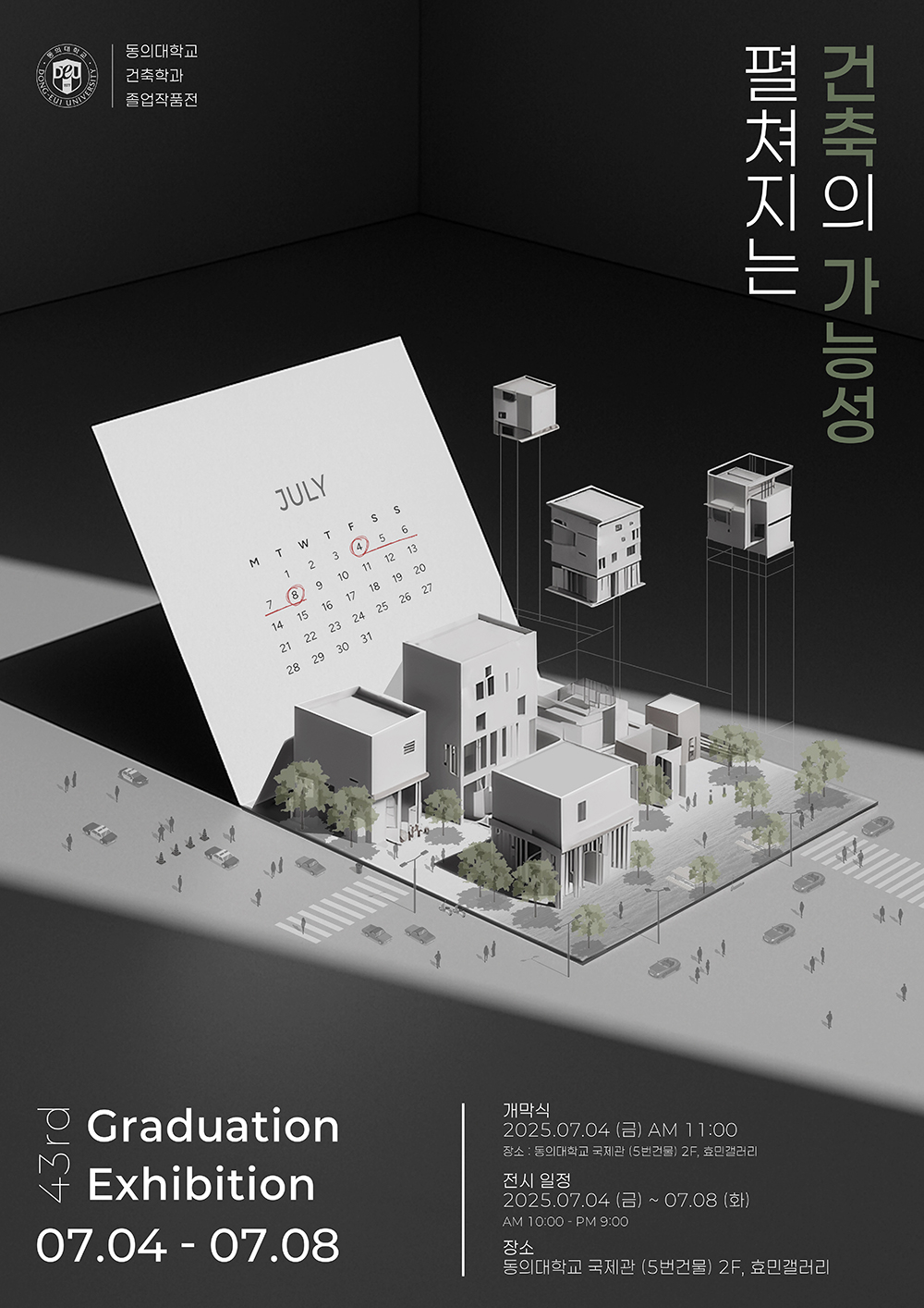 2025년 07월 04일(금)~07월 08일(화) 동의대학교 국제관 2층 효민갤러리에서 <펼쳐지는 건축의 가능성>을 주제로 진행된 졸업작품전(5학년 담당교수: 신병윤, 석민철, 전상욱, 김은희, 강영)은 지난 5년간 땀과 열정으로 빚어낸 소중한 결실이자, 건축가로서의 첫 발걸음을 내딛는 의미 있는 순간으로 기억되길 소망합니다.