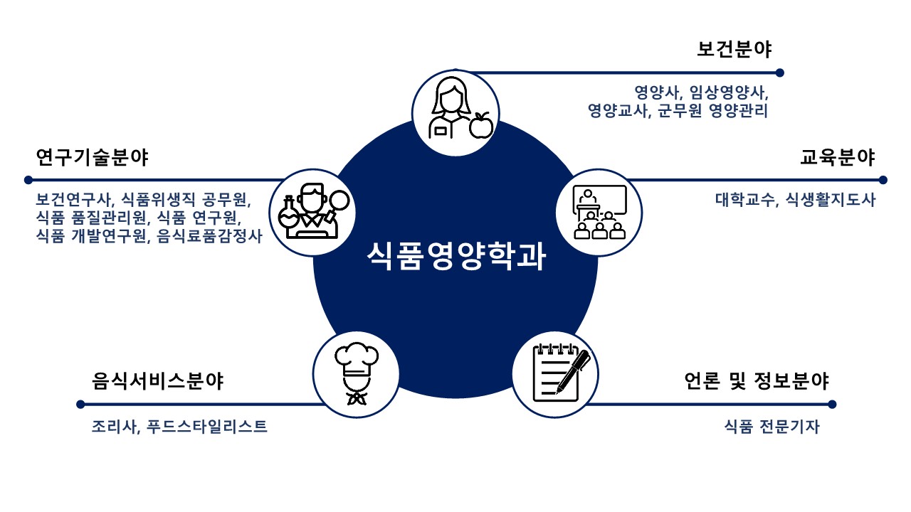 사회진출영역 | 병원 임상영양사, 산업체 급식영양사, 초.중등학교 영양교사, 단체급식 관련 위탁회사 영양사, 지역사회 보건영양사, 보건직 공무원, 식품위생직 공무원, 식품제조회사 연구원, 정부연구기관 연구원, 생명과학분야 연구원, 상담영양사, 사회보호시설 영양관리자, 영양상담원(비만 클리닉 센터 등), 조리학원 강사, 대학원 진학 등 |