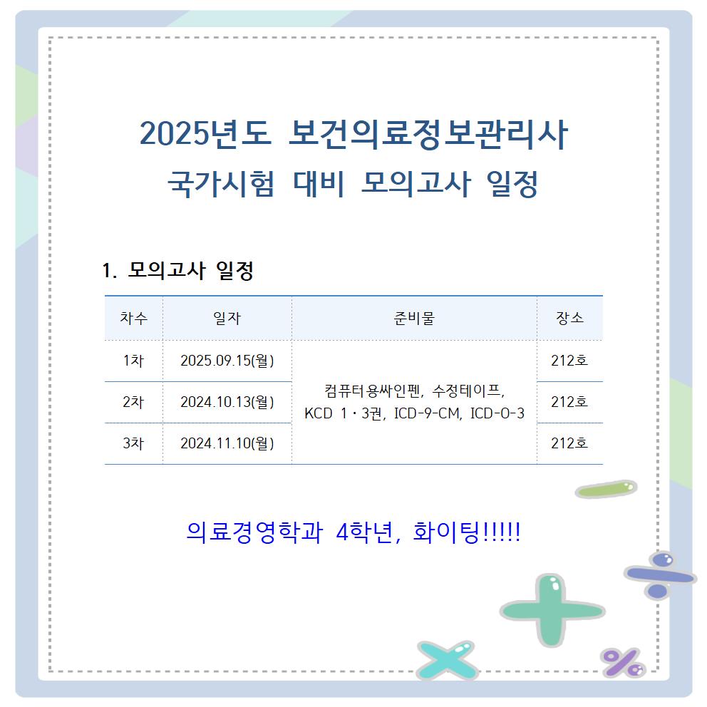 2025학년도 보건의료정보관리사 국가시험 대비 모의고사 일정