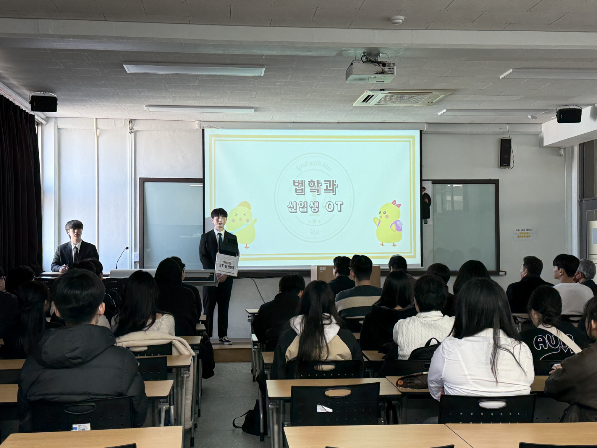 학과 OT는 학과 소개 교수님 소개 및 축하 말씀- 학생회 소개 - 과장 디자인 소개 - 캠퍼스 소개- 주요 행사 일정 - 공지사항 및 Q&A - 소법전 증정식 - 기념 촬영 순으로 진행되었습니다.