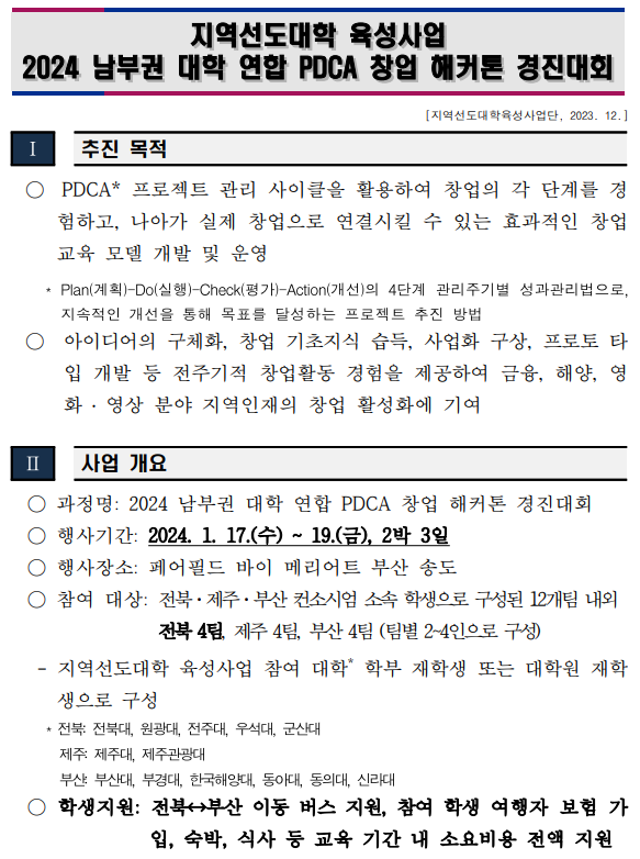 ◦ 아이디어의 구체화, 창업 기초지식 습득, 사업화 구상, 프로토타입 개발 등 전주기적 창업활동 경험을 제공하여 금융, 해양, 영화․영상 분야 지역인재의 창업 활성화에 기여를 목표로하는 경진대회 입니다.