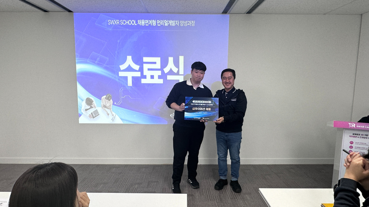 3/8일, 삼우이머션에서 언리얼 엔진 개발 분야의 우수한 인재 양성을 위한 『SWXR SCHOOL 채용연계형 언리얼개발자 양성과정』의 수료식이 진행되었습니다. 이 과정은 언리얼 엔진 분야의 우수한 인재 양성을 목적으로 한 것으로, 교육생들은 밀도 높은 이론 및 실습 교육을 통해 언리얼 엔진의 전문가로 성장하며, 수료자 중 우수평가를 받은 이들에게는 삼우이머션의 채용 기회가 제공되는 강의입니다.