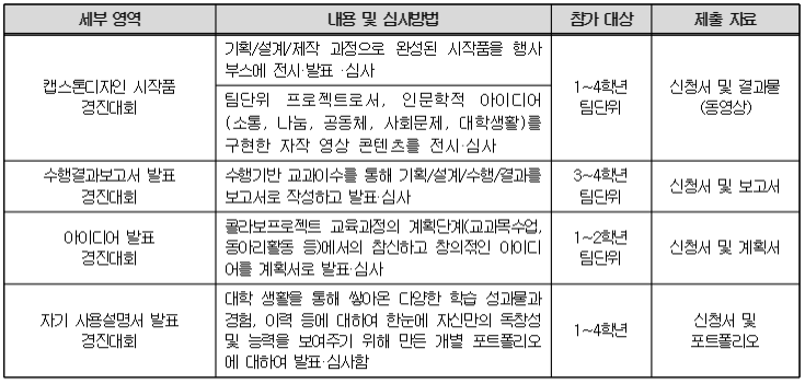 마. 대회목적: 재학생들의 팀 단위 수행기반 교과 및 비교과 학습 성과를 경합·공유하고 확산할 수 있는 자리와 기회를 마련하여, 학문·전공에 국한되지 않고 넓은 시야로 세상을 바라볼 수 있는 콜라보 인재 육성