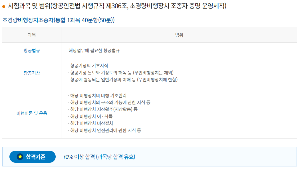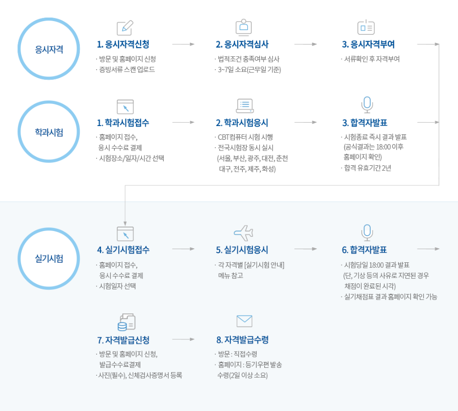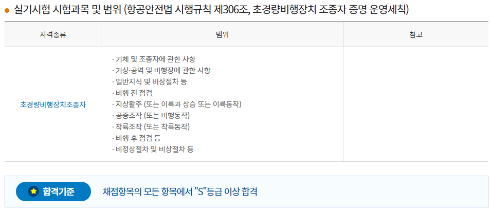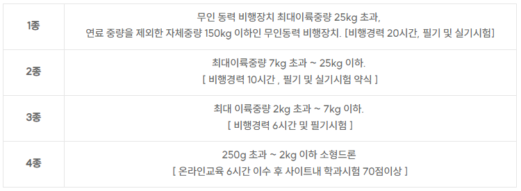 자격 공통사항 : 비행경력은 안전성 인증검사, 비행승인 등의 적법한 기준 및 절차를 따른 경력을 말하고, 만 14세 이상이 취득 가능합니다. 그리고 2종 보통 이상의 유효한 운전면허증(운전면허증 내 적성검사기간 또는 갱신기간이 유효한 경우) 또는 이를 발급받기 위한 신체검사증명서가 주요 응시조건입니다. -