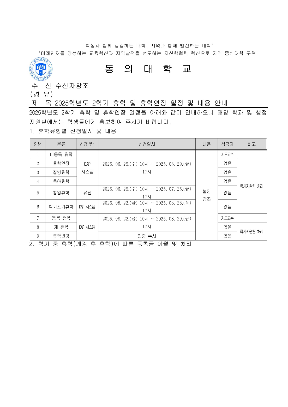 2025학년도 2학기 휴학 안내문