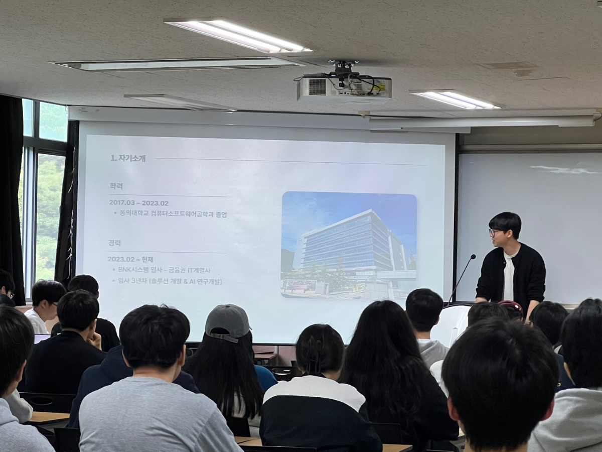 지난 5월16일(금), 컴퓨터소프트웨어공학과는 BNK시스템에 연구원으로 재직중인 안0현씨를 초청해 소프트웨어 엔지니어링 분야의 실무 중심 특강을 진행하였습니다.