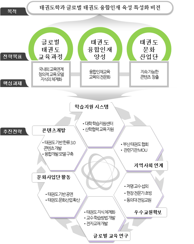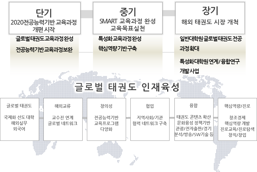 2025년 동북아 및 글로벌 태권도 선도를 위한 전공능력기반 태권도 지식의 체계화를 바탕으로 글로벌 태권도 교육 및 해외파견을 위한 융합인재 양성과 더불어 퓨전태권도 문화공연팀을 통한 문화예술활동(태권도 기반의 한류 3.0 콘텐츠 확산)을 목표로 하고 있습니다.