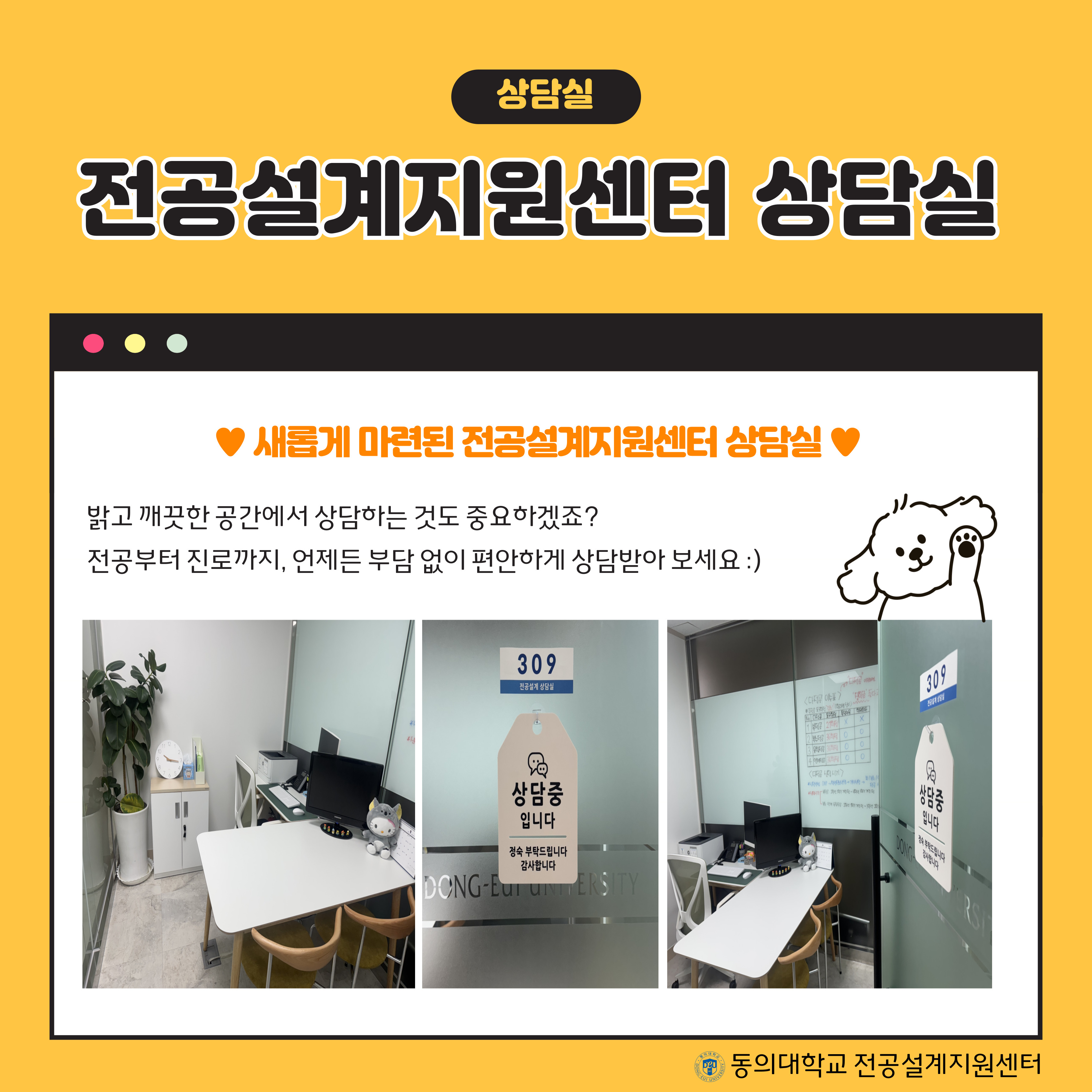더불어 2025학년도 2학기를 시작으로, 전공설계지원센터 상담실이 새롭게 오픈하여 보다 쾌적한 분위기에서 상담이 가능합니다.