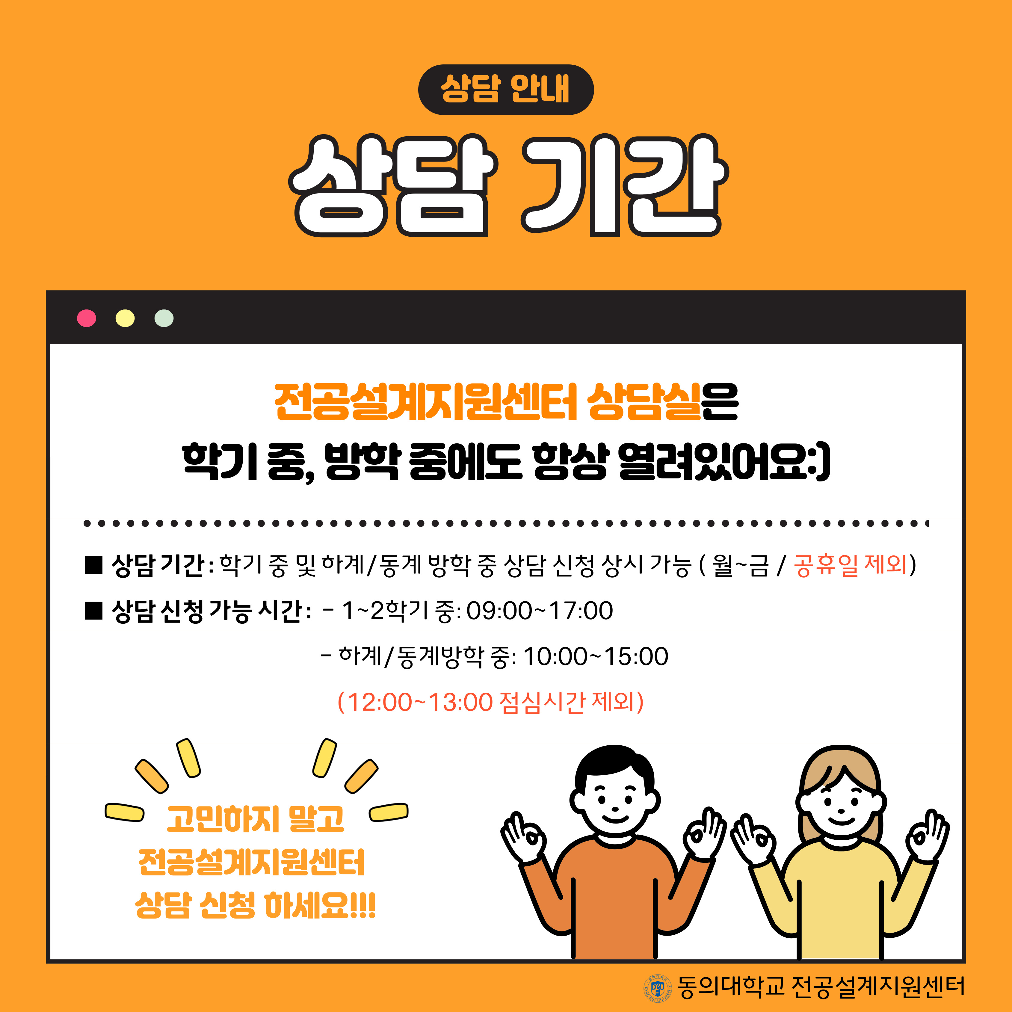 🧡상담 기간 : 학기중(09:00~17:00) 및 방학 중(10:00~15:00) 상시 신청 가능 (공휴일 및 점심시간 12:00~13:00 제외)
