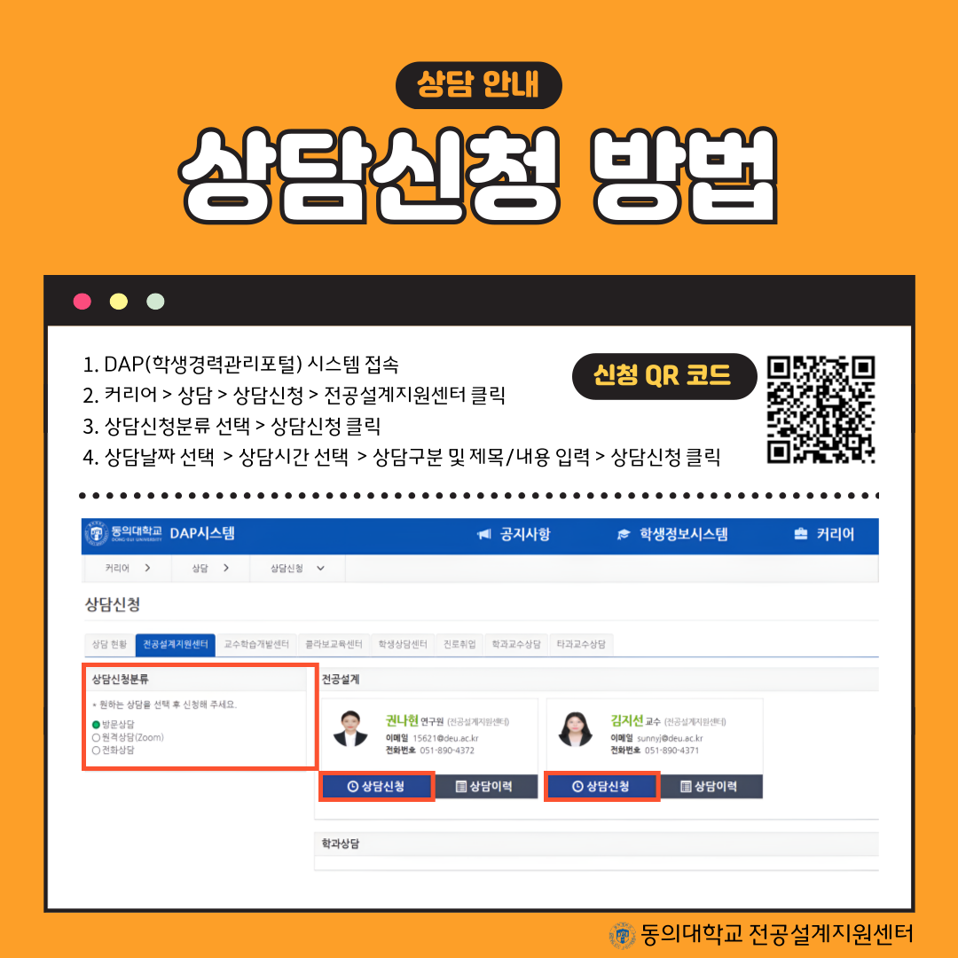 💜상담 신청 방법 : DAP 시스템 > 커리어 > 상담 > 상담신청 > 전공설계지원센터 > 상담신청 분류 택 > 상담 교원의 상담 신청 버튼